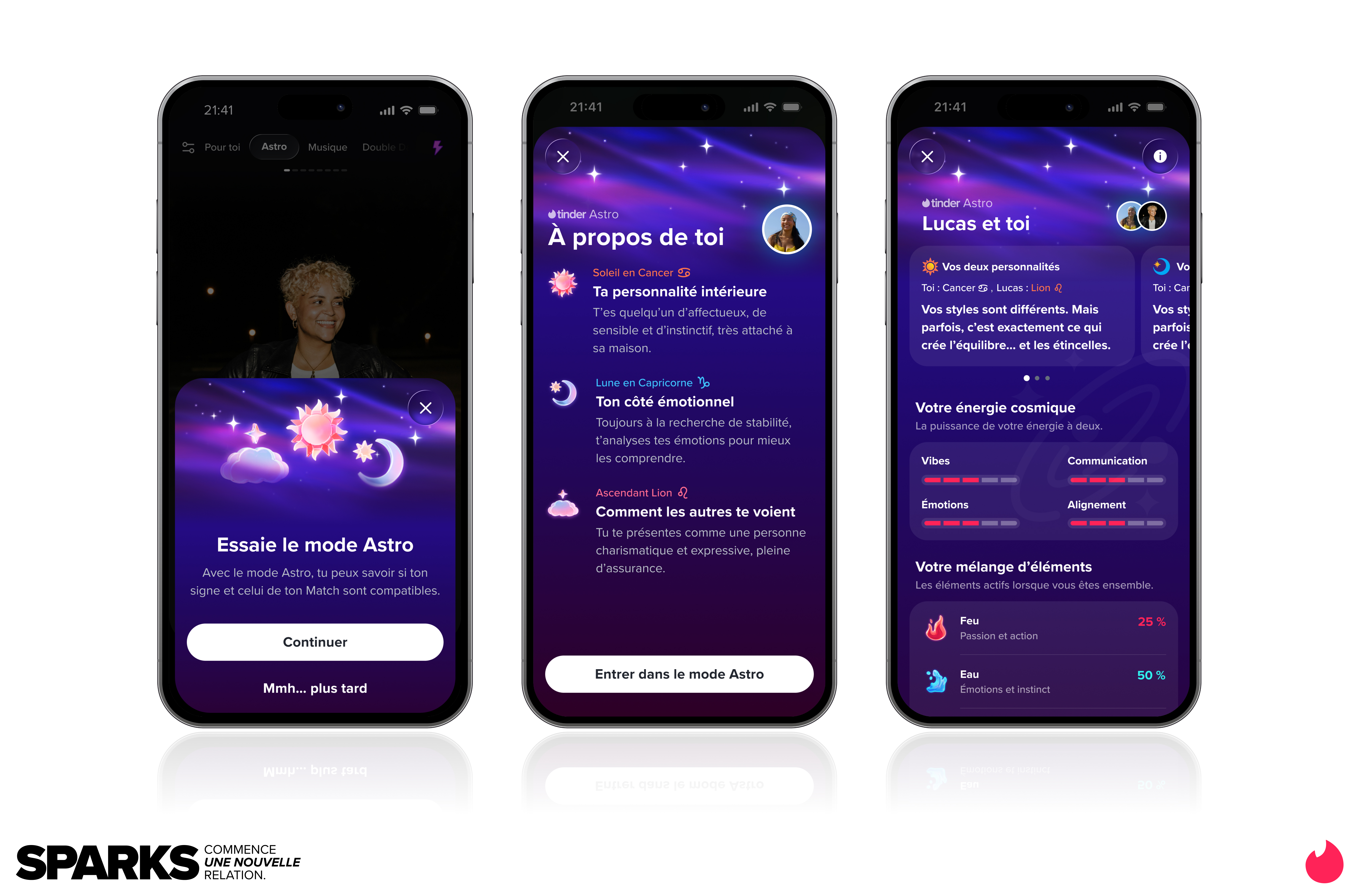 C’est dans ce contexte que Tinder a annoncé lors de sa toute première conférence de presse mondiale “Tinder Sparks 2026 : Start Something New” le lancement d’Astro Mode en France. Cette nouvelle fonctionnalité invite les utilisateur·rices à ajouter leurs informations de naissance pour révéler leurs signes solaire, lunaire et leur ascendant… et découvrir ce que les étoiles disent de leur compatibilité avec un match potentiel.